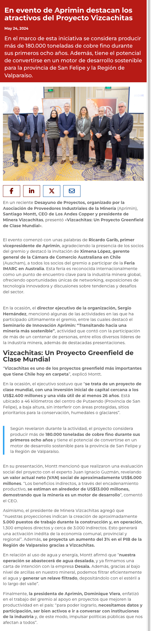 En Desayuno de Proyectos APRIMIN se presentó Vizcachitas: Un Proyecto Greenfield de Clase Mundial - (mvcomunicaciones.cl)