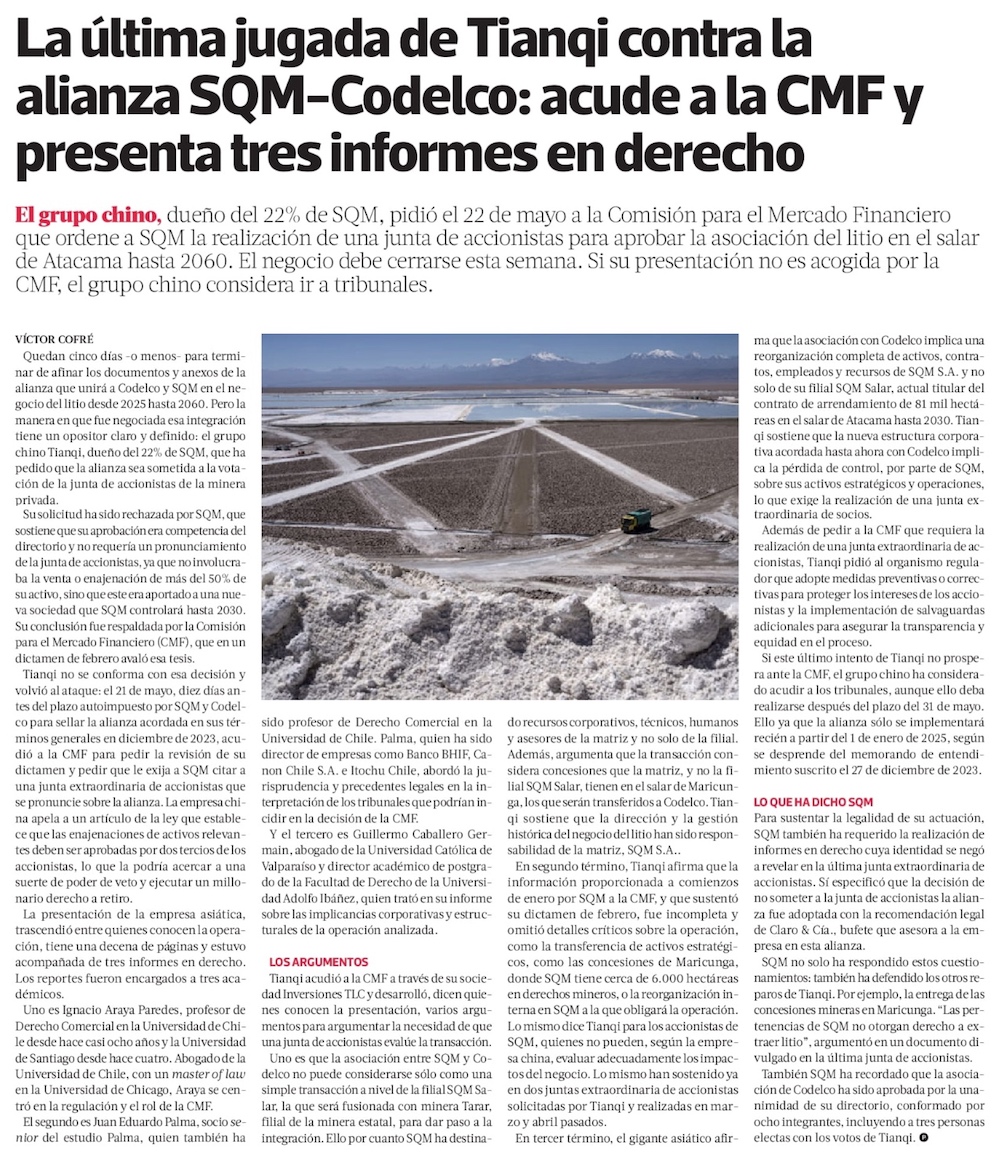 Las últimas cartas de Tianqi: consulta a CMF si acuerdo Codelco-SQM debe ser aprobado en junta de accionistas - (Diario Financiero)