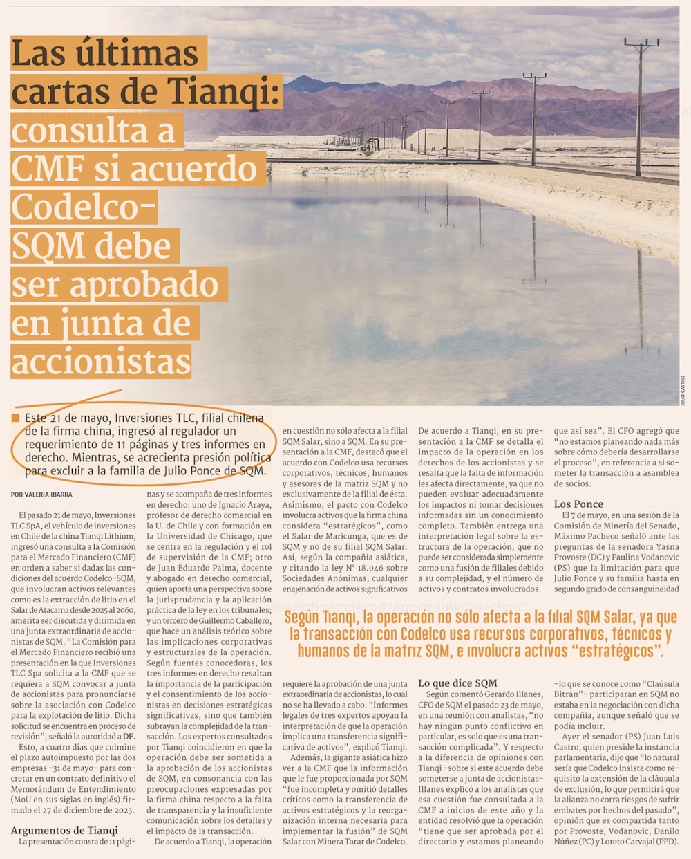 Tianqi vuelve a la carga contra acuerdo SQM-Codelco, y oficialismo se “desordena” con solicitud de nueva cláusula para mantener al margen a Ponce - (El Mercurio de Santiago)