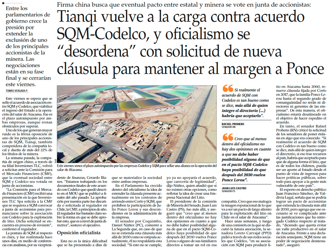Las últimas cartas de Tianqi: consulta a CMF si acuerdo Codelco-SQM debe ser aprobado en junta de accionistas - (Diario Financiero)