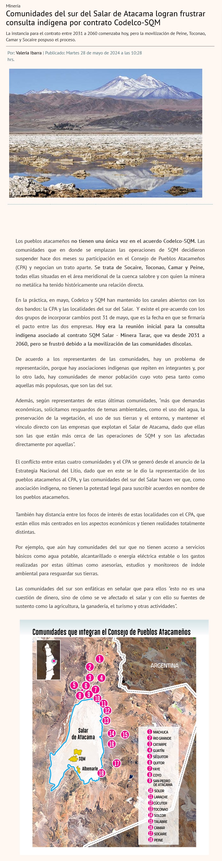 San Pedro: Corfo suspende el inicio de la Consulta Indígena por contrato Codelco-SQM - (El Mercurio de Antofagasta)