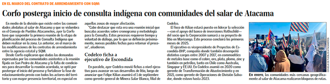 San Pedro: Corfo suspende el inicio de la Consulta Indígena por contrato Codelco-SQM - (El Mercurio de Antofagasta)