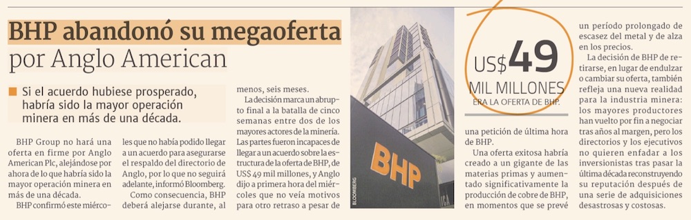No hay acuerdo entre BHP y Anglo American y se cae operación por US$ 49 mil millones - (El Mercurio de Santiago)