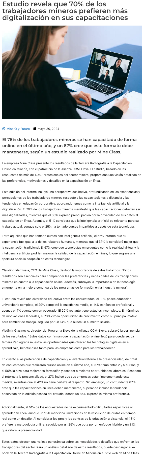 Tercera Radiografía a la Capacitación Online en Minería: 70% de las y los trabajadores mineros desean una mayor digitalización en sus capacitaciones - (portalinnova.cl)