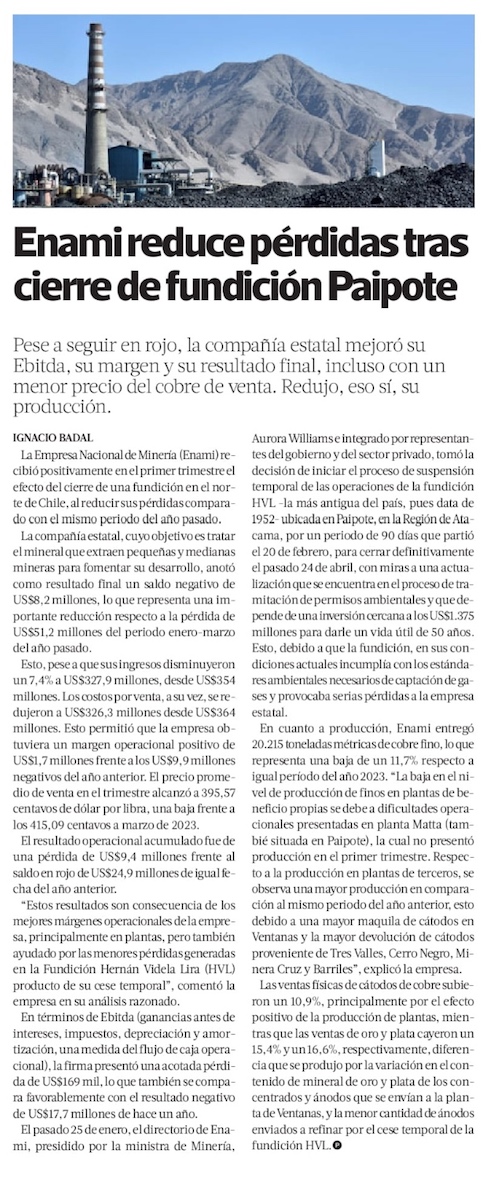 Enami redujo pérdidas según informe: pagan de US$ 51,1 millones a US$8,2 millones - (El Diario de Atacama)