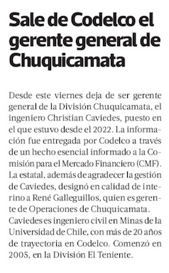 Minera estatal informa salida del Gerente General de la División Chuquicamata - (El Mercurio de Santiago)