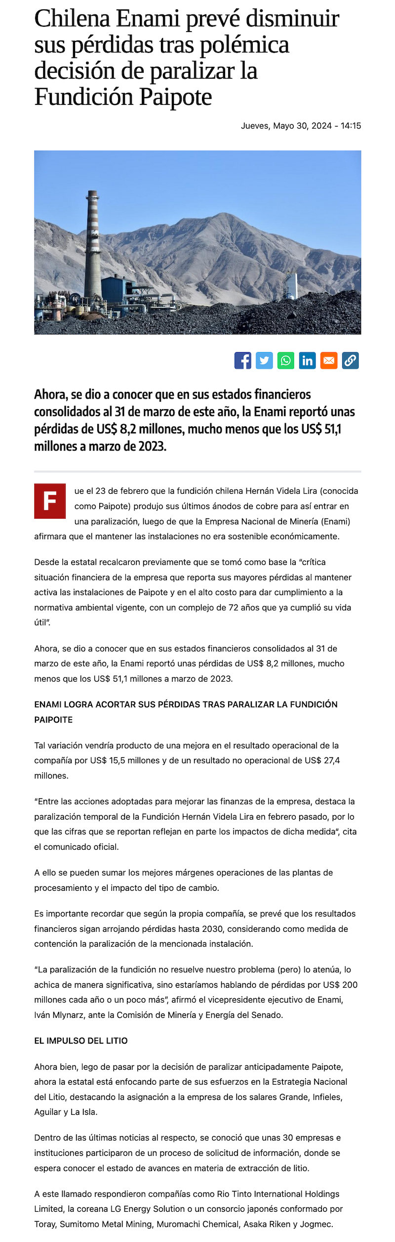 Enami redujo pérdidas según informe: pagan de US$ 51,1 millones a US$8,2 millones - (El Diario de Atacama)