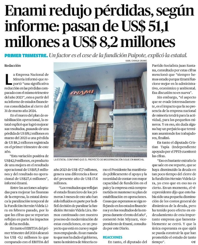 Chilena Enami prevé disminuir sus pérdidas tras polémica decisión de paralizar la Fundición Paipote - (americaeconomia online)