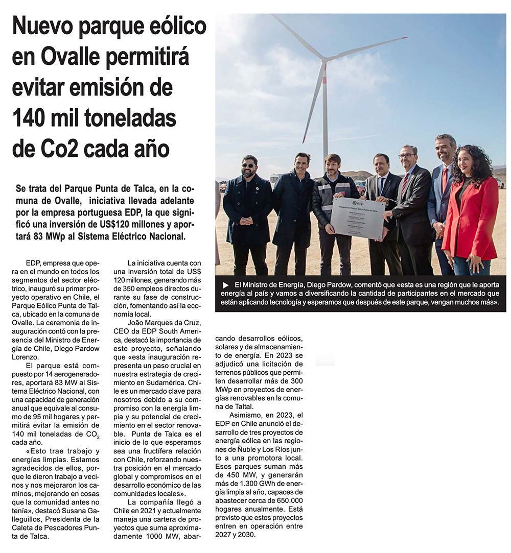 Empresa portuguesa inaugura un nuevo parque eólico en Ovalle - (El Día)