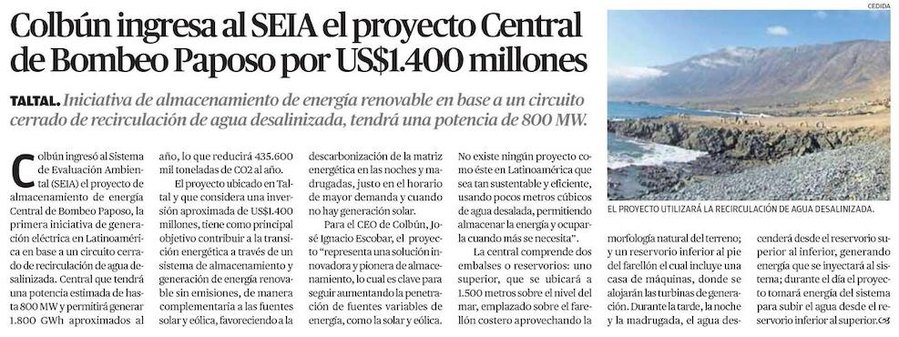 Colbún presenta proyecto por US$1.400 millones - (El Mercurio de Santiago)