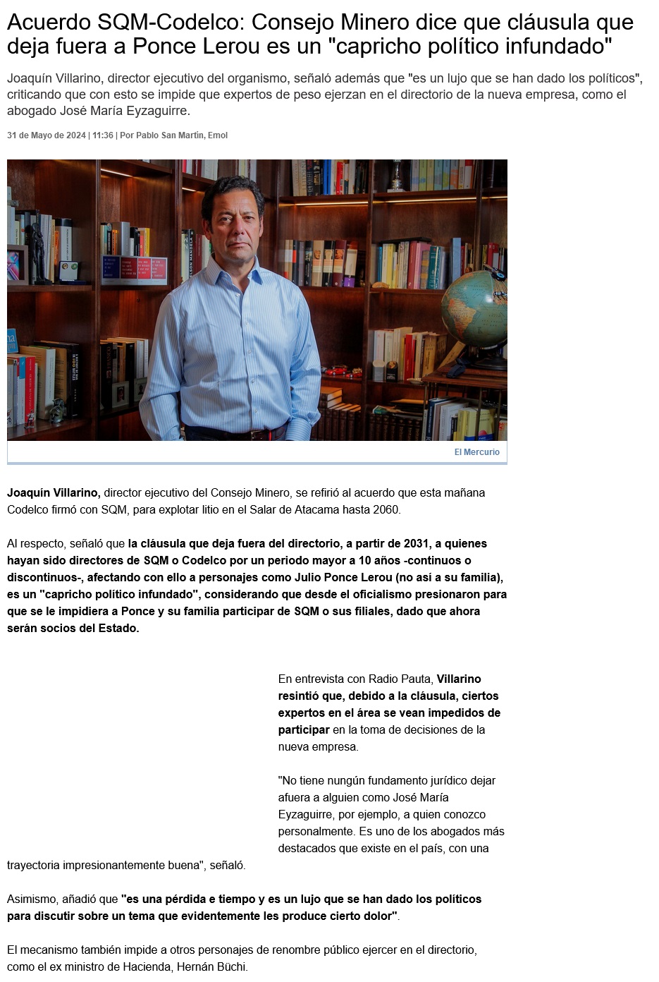 Acuerdo Codelco-SQM: Consejo Minero acusa “capricho político” por cláusula que impide a Ponce Lerou llegar al directorio - (soyantofagasta)