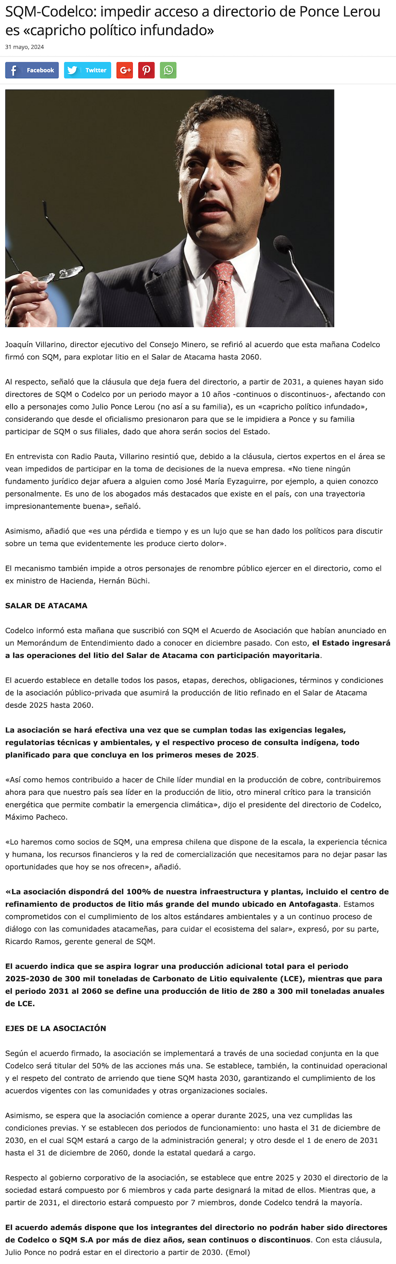Codelco y SQM sellan una asociación que deja fuera a Ponce Lerou hasta 2031 - (Medios Regionales Cadena El Mercurio)