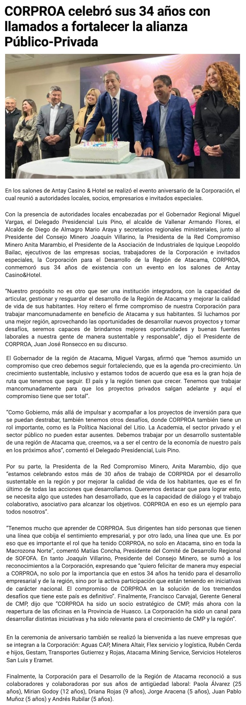 Durante el 34º Aniversario el presidente de Corproa hizo un llamado al sector público privado a luchar y a trabajar por una mejor región de Atacama - (revistacrisol.cl)