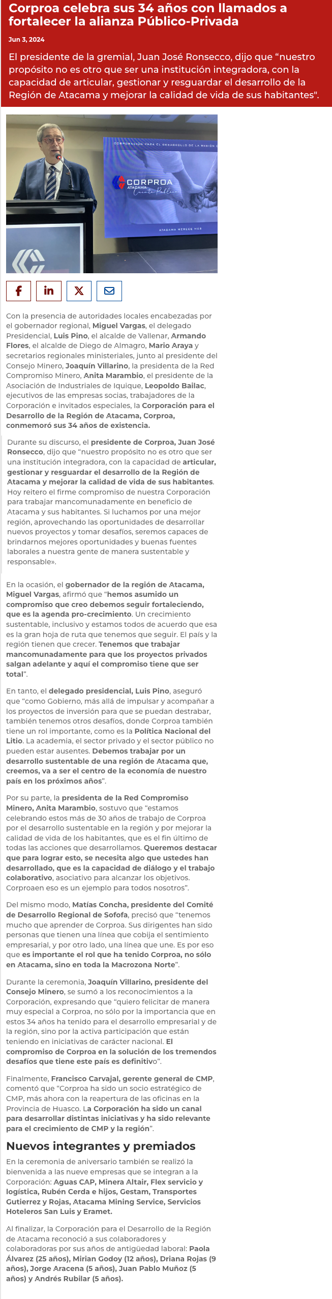 Corproa celebró sus 34 años con llamados a fortalecer la alianza Público- Privada - (atacamanoticias)