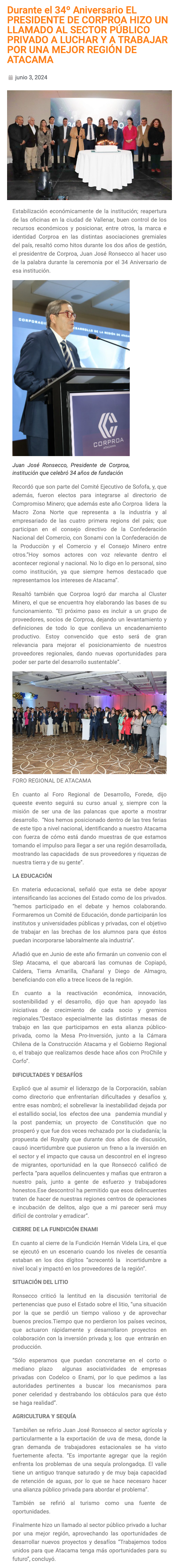 Corproa celebró sus 34 años con llamados a fortalecer la alianza Público- Privada - (atacamanoticias)