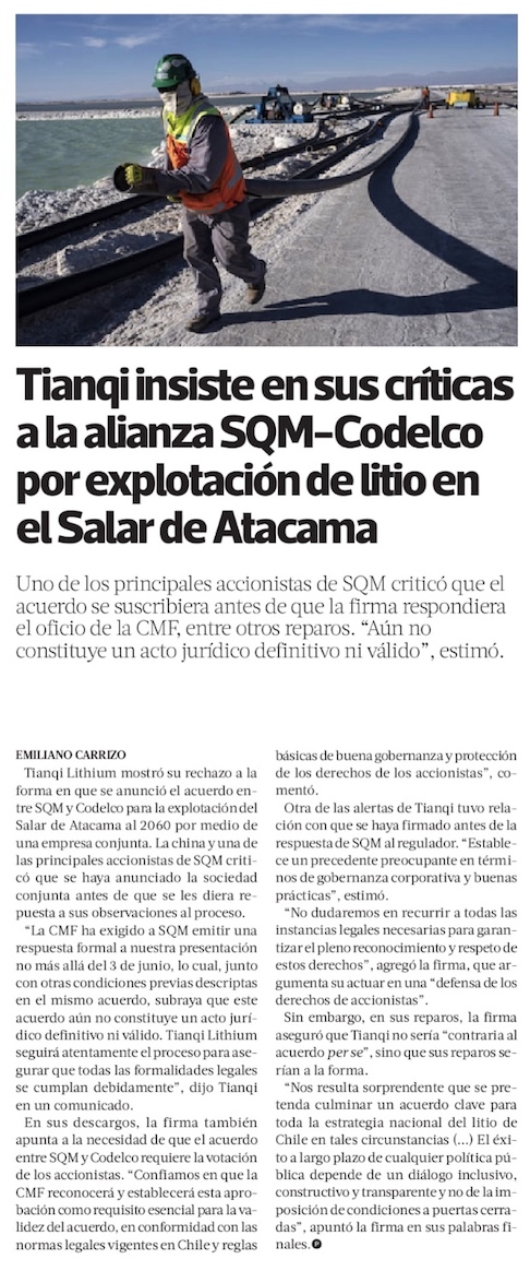 Tianqi arremete contra acuerdo SQM-Codelco y advierte sobre riesgos por la operación - (El Mercurio de Santiago)