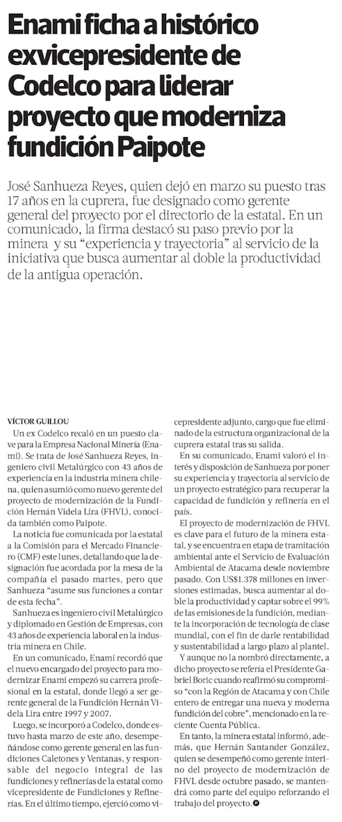Enami nombra a nuevo gerente de Paipote - (El Mercurio de Santiago)