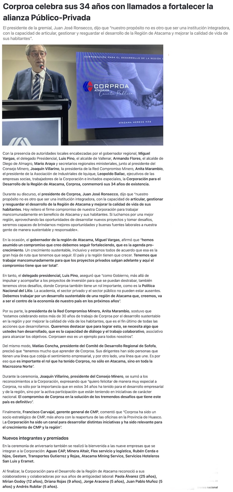 Corproa celebró sus 34 años con llamados a fortalecer la alianza Público- Privada - (rtnoticias.cl)