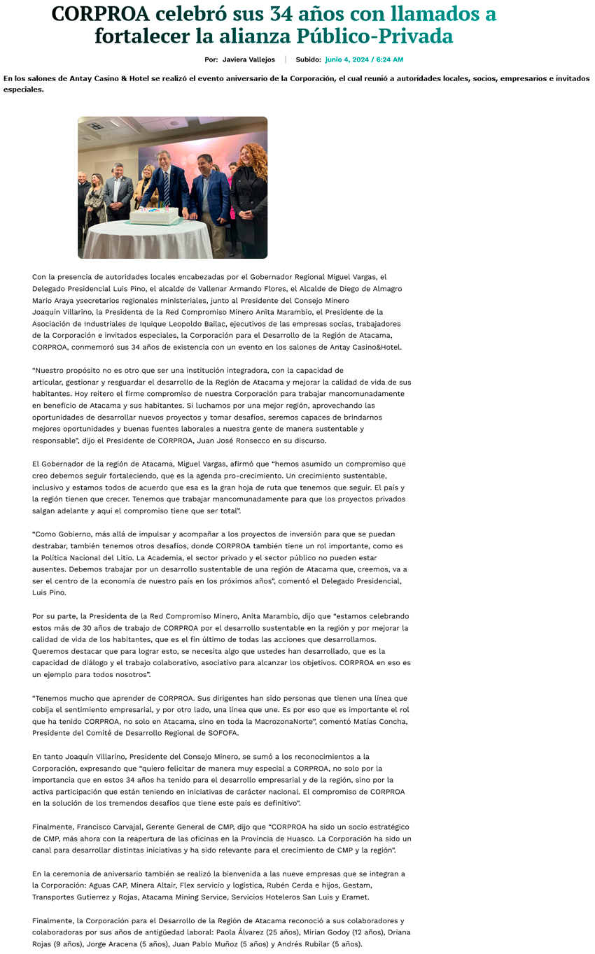 Corproa celebró sus 34 años con llamados a fortalecer la alianza Público- Privada - (El Chañarcillo)