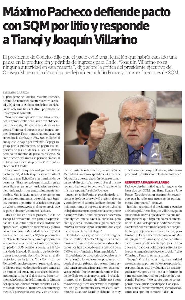 Máximo Pacheco defiende acuerdo con SQM por producción de litio: desestima las críticas de Tianqi y de Joaquín Villarino - (La Tercera Online)