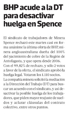 BHP solicita a la Dirección del Trabajo mediación con sindicato de Spence - (El Mercurio de Antofagasta)