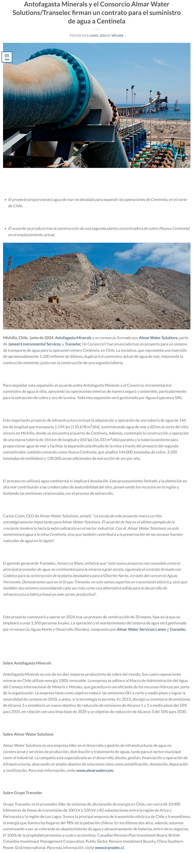 AMSA adjudica a un consorcio proyecto hídrico por US$ 1.500 millones - (El Mercurio de Santiago)