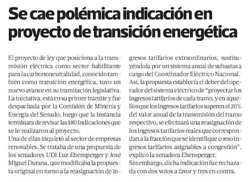 Avanza proyecto clave para las renovables en el Senado - (El Mercurio de Santiago)