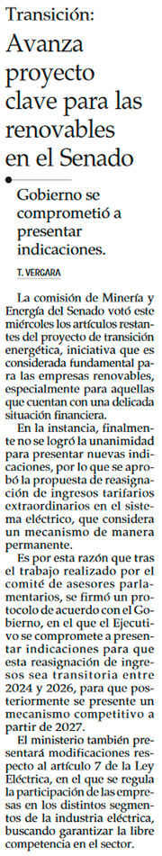 Senadores aprueban en particular proyecto de transición energética, pero firman acuerdo para futuros ajustes - (Diario Financiero)