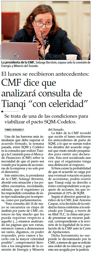 CMF y requerimiento de Tianqi contra acuerdo Codelco-SQM: "Vamos a demorarnos un tanto en poder responder, pero lo haremos con la mayor celeridad posible" - (Pulso)