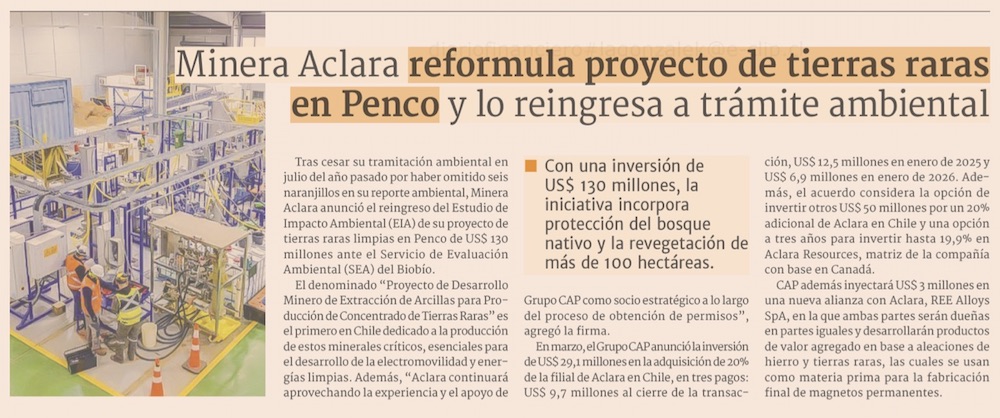 Aclara insiste con proyecto de Tierras Raras en Biobío - (El Mercurio de Santiago)