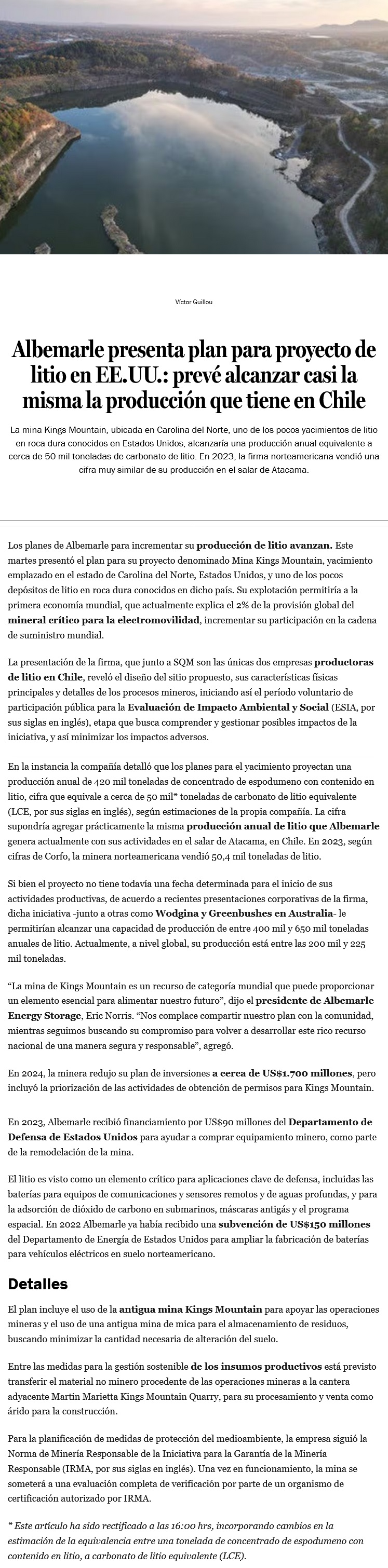 Albemarle presenta plan para proyecto de litio en EE.UU.: prevé alcanzar casi la misma la producción que tiene en Chile - (Pulso)