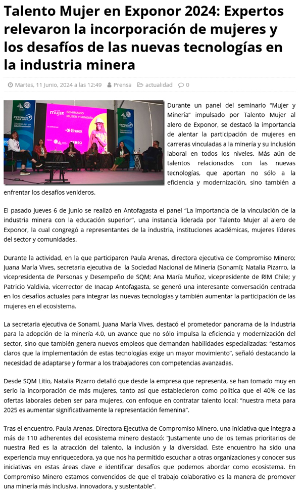 Talento Mujer en Exponor 2024: Expertos relevaron la incorporación de mujeres y los desafíos de las nuevas tecnologías en la industria minera - (antofagastanoticias)
