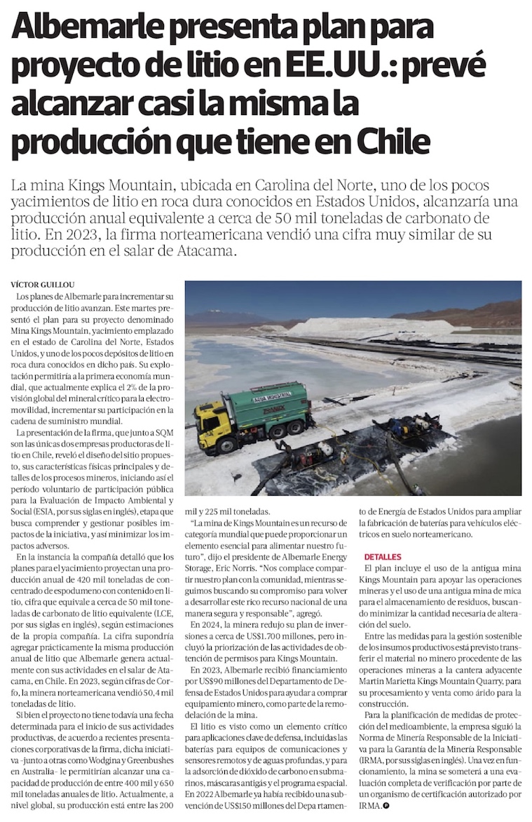 Albemarle presenta plan para proyecto de litio en EE.UU.: prevé alcanzar casi la misma la producción que tiene en Chile - (DF Online)