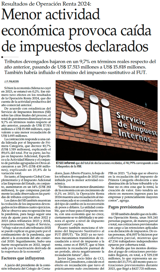 Impuestos declarados en la Operación Renta 2024 cayeron a su menor nivel en los últimos tres años - (Diario Financiero)