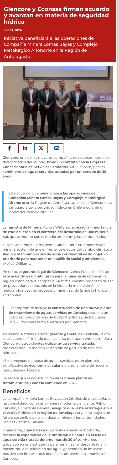 Glencore funcionará con inédito modelo de circularidad hídrica - (El Mercurio de Antofagasta)