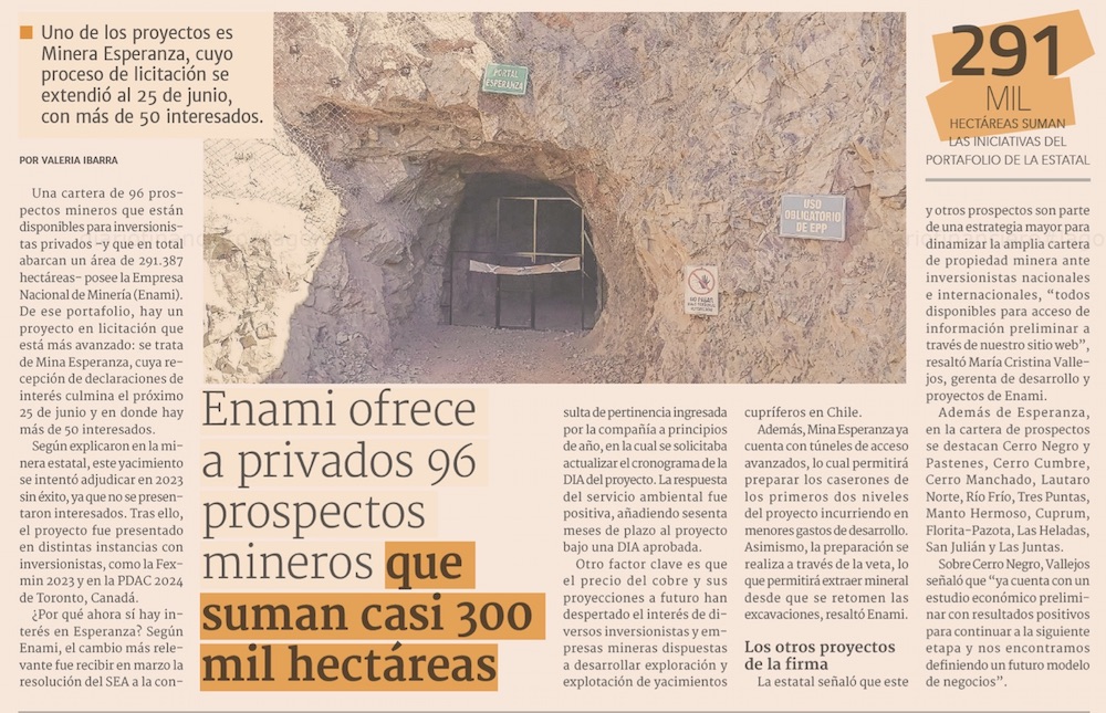 Enami recibe más de 50 interesados en licitación para vender o arrendar mina Esperanza - (Pulso)