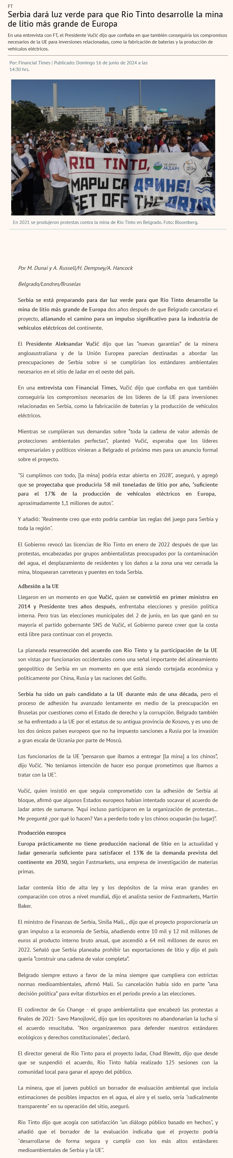 Serbia dará luz verde para que Rio Tinto desarrolle la mina de litio más grande de Europa - (Diario Financiero)