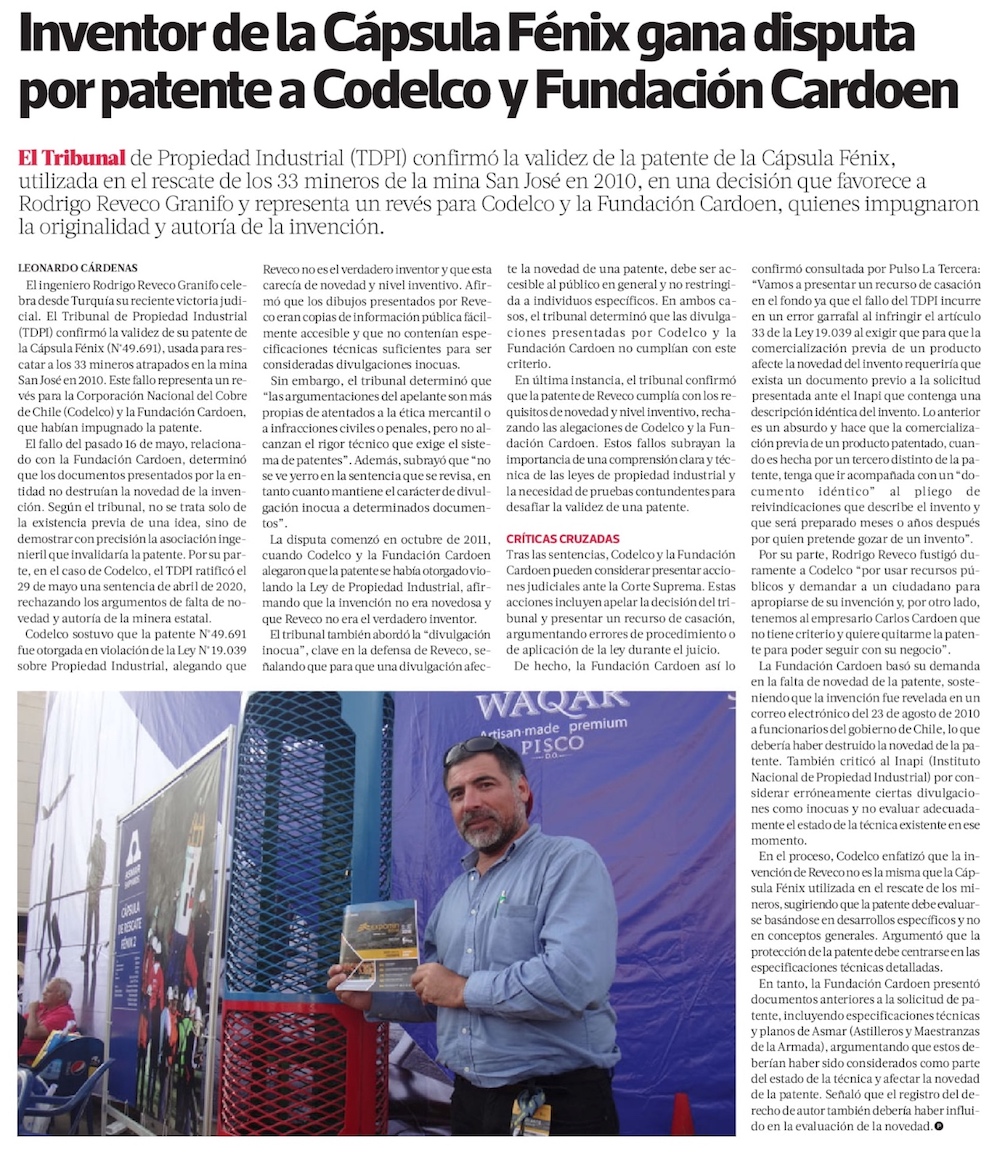 Inventor de la Cápsula Fenix gana disputa por patente a Codelco y Fundación Cardoen - (La Tercera)