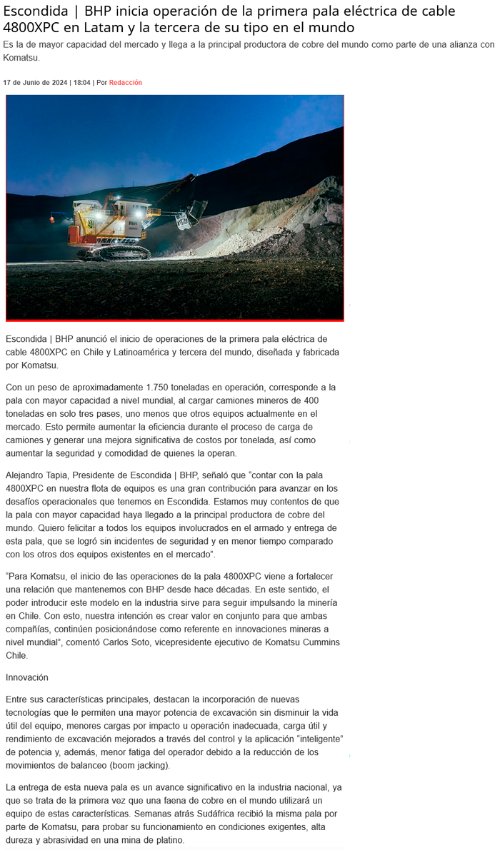 Escondida | BHP incorpora a sus operaciones la pala con mayor capacidad a nivel mundial - (mch.cl)