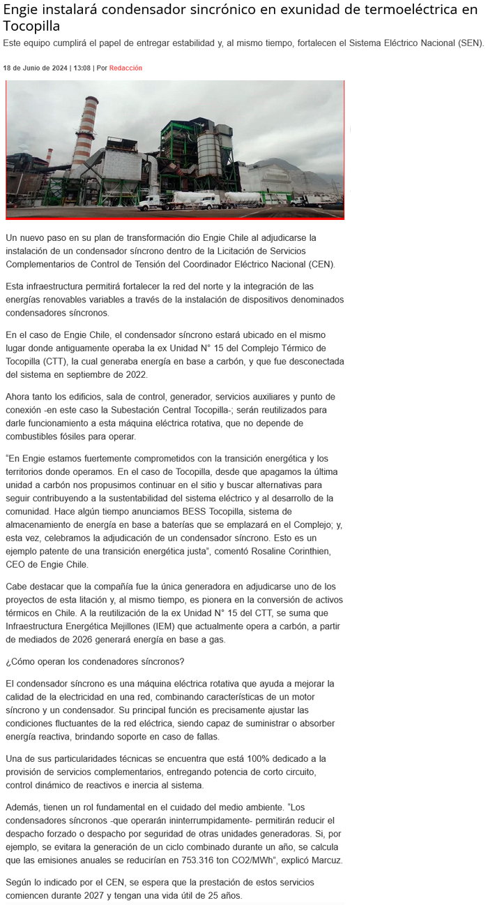 Engie iniciará trabajos de conversión de exunidad a carbón de complejo de Tocopilla en segundo semestre - (Diario Financiero)