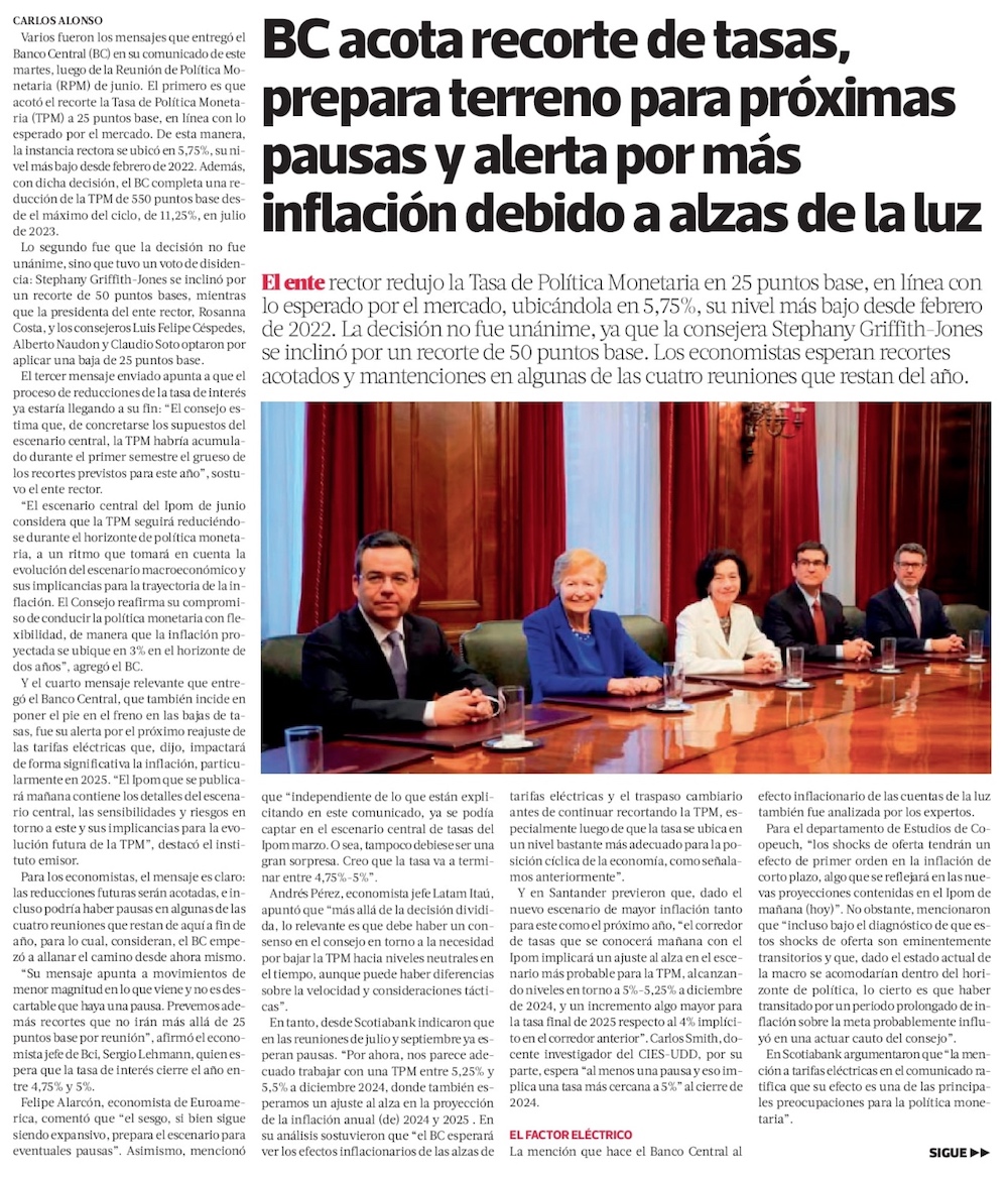 Banco Central abre camino a una pausa en la baja de tasas y advierte que alza de la luz afectará IPC sobre todo en 2025 - (Diario Financiero)