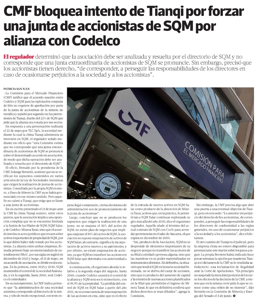 CMF cierra por segunda vez intento de Tianqi de revisar el acuerdo SQM-Codelco en junta de accionistas - (El Mercurio de Santiago)