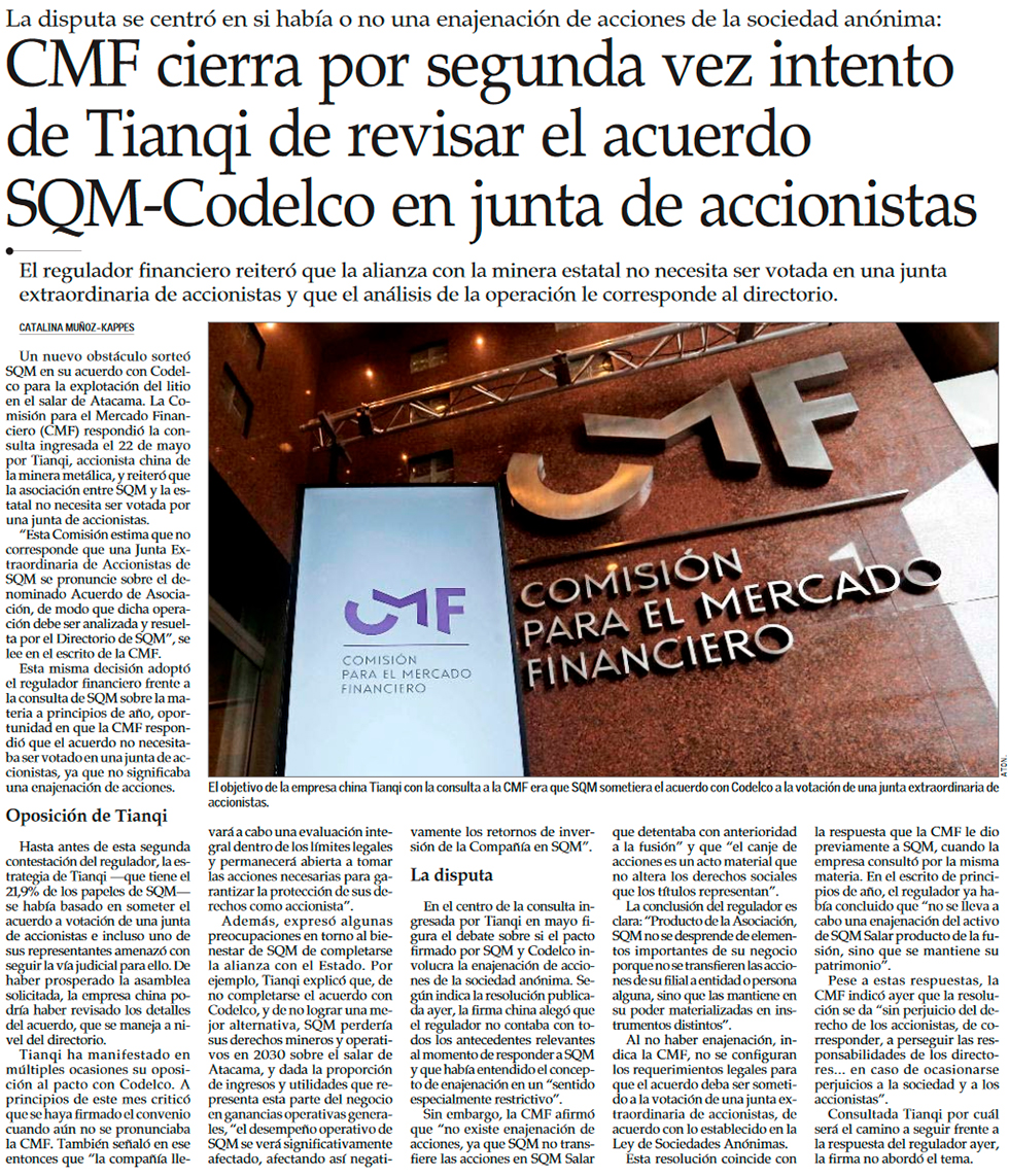 CMF da portonazo a Tianqi: no se requiere junta de accionistas para aprobar acuerdo SQM-Codelco - (Diario Financiero)