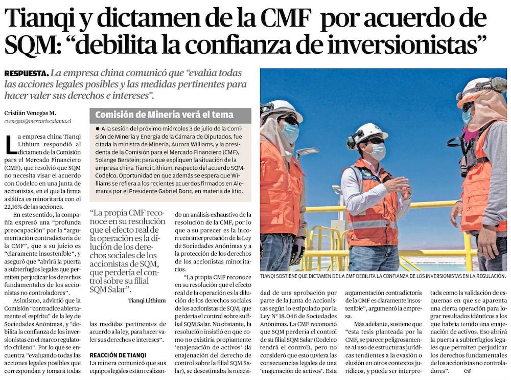 Tianqi apunta sus dardos contra la CMF - (El Mercurio de Santiago)