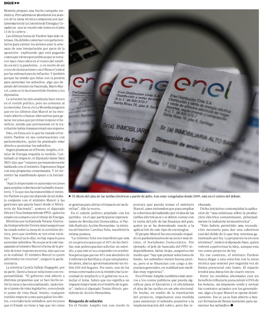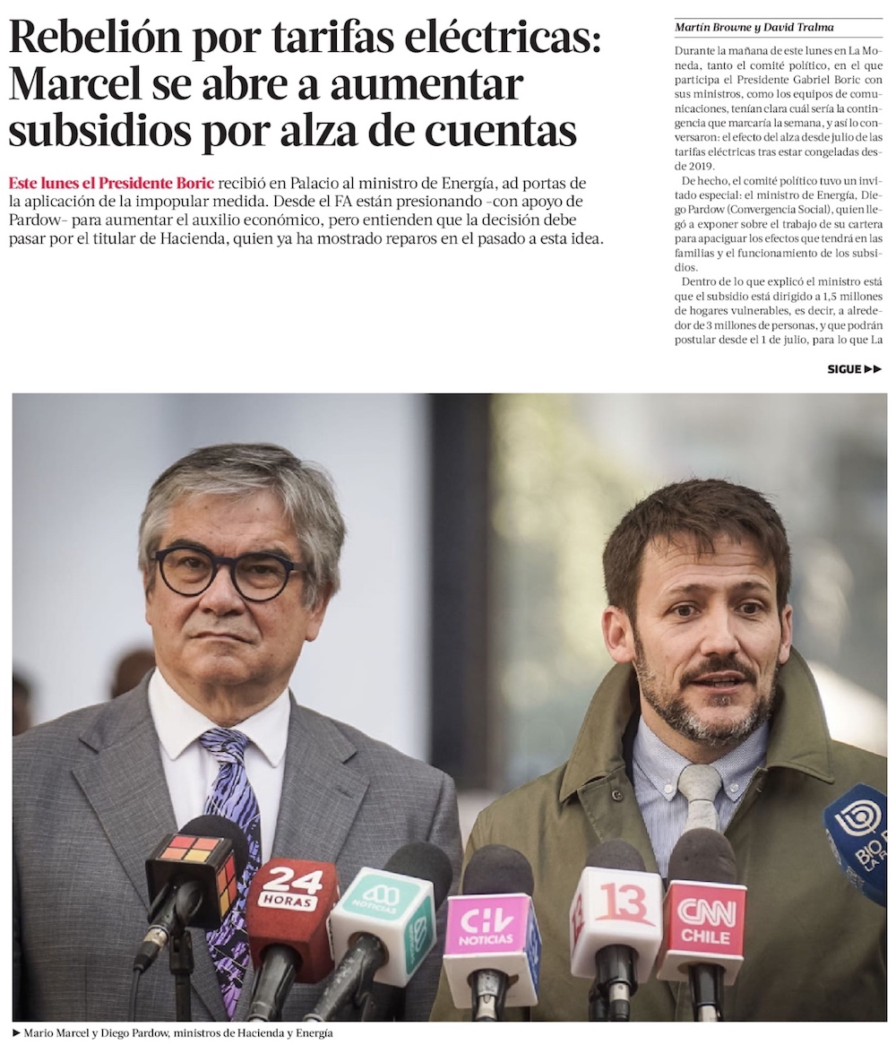 Oficialismo en alerta tras alza de tarifas eléctricas: notifican preocupación a La Moneda y temen impacto electoral - (El Mercurio de Santiago)