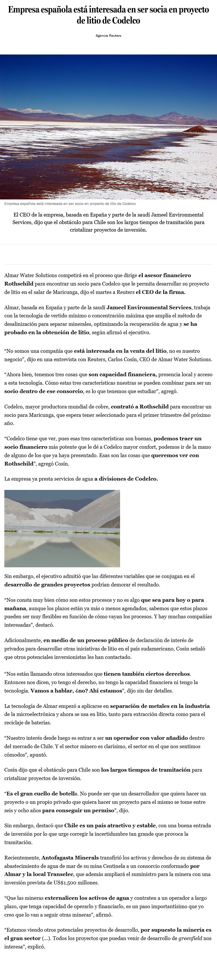 Empresa española está interesada en ser socia en proyecto de litio de la estatal Codelco en Maricunga - (Pulso)