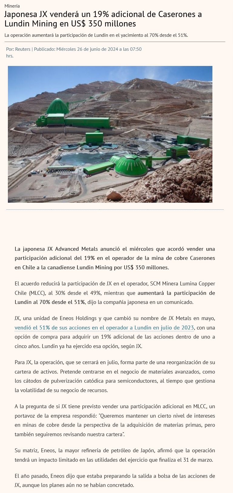 Japonesa JX vende parte de propiedad en mina Caserones - (Pulso)