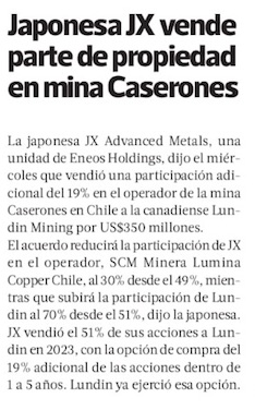 Japonesa JX venderá un 19% adicional de Caserones a Lundin Mining en US$ 350 millones - (DF Online)