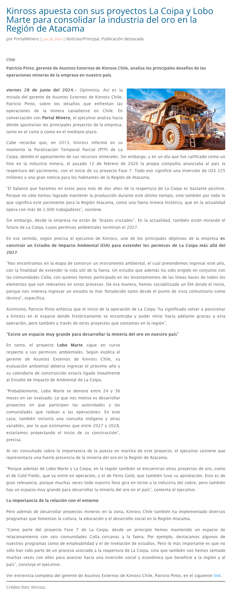 Kinross propone nuevo proyecto para consolidar la industria del oro en Atacama - (madero.cl)