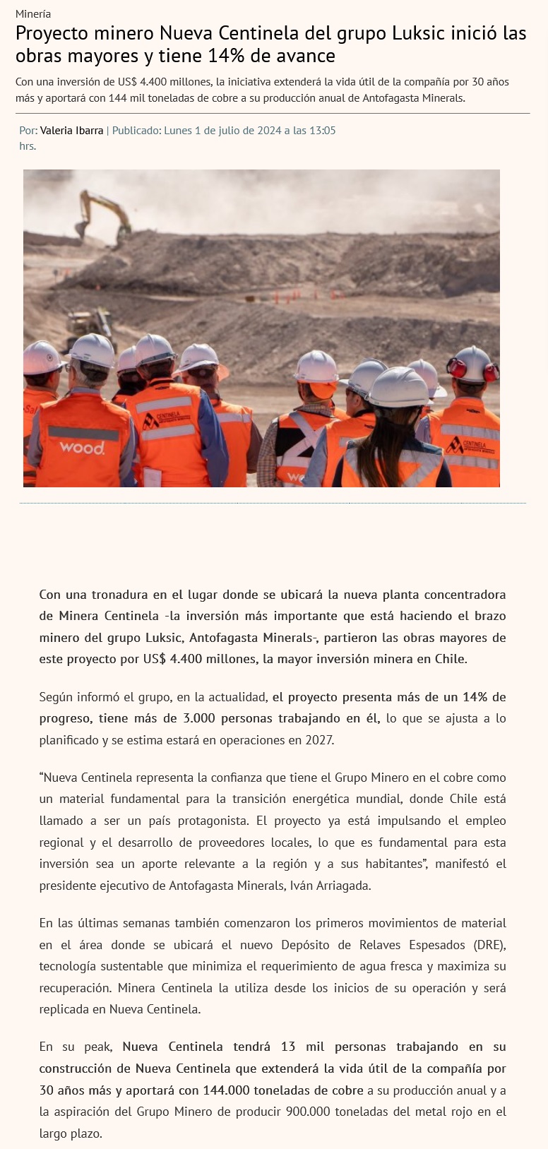 Proyecto Nueva Centinela presenta un 14% de avance - (El Mercurio de Santiago)